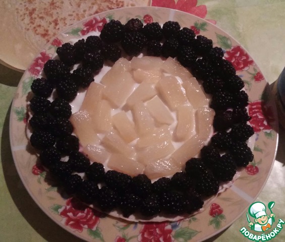 Для нашего тортика нам понадобится четыре блинчика. Начинаем формировать. Первый блин смазываем йогуртом, по краям выкладываем ежевику и в середину кусочки ананаса.