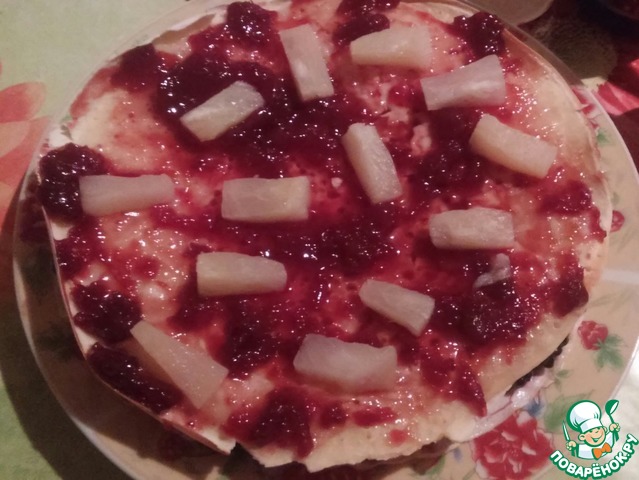 Накрываем вторым блином, смазываем вишневым вареньем и кладем опять немного ананасов.