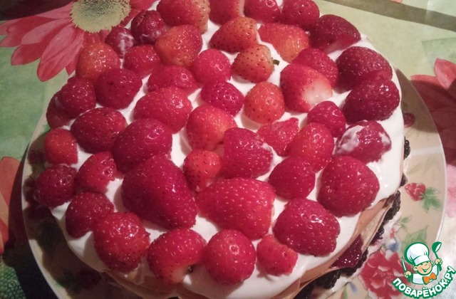 Сверху блин, смазываем его йогуртом и выкладываем половинки клубники.