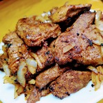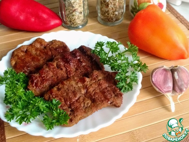 Чаще всего говяжью печень мы либо жарим, вымочив для нежности в молоке, потом обваляв в муке. Или тушим в сметане. Самые простые блюда. Оладьи печеночные, уже посложнее. Я хочу вам предложить очень вкусное блюдо из говяжьей печени. Важно печенку не пересушить. И снять ее с огня чуть раньше, ведь печень сама себя доготовит. На все про все 10 минут. Удобно замариновать с утра, и вечером будет просто ужин, без заморочек. Готовим?