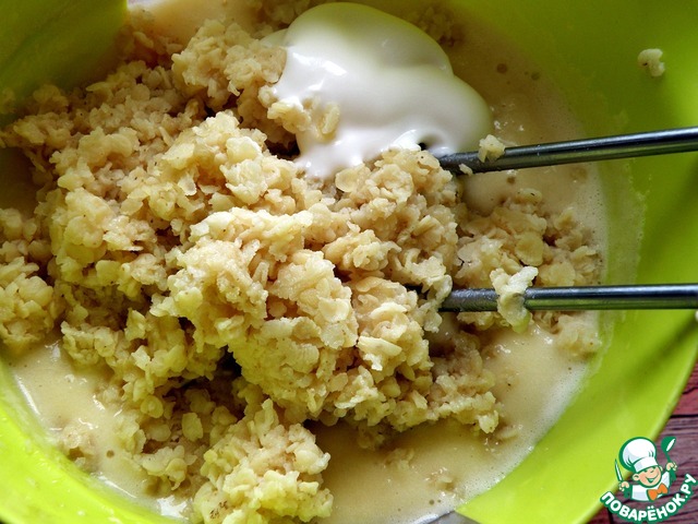 На низких оборотах миксера вмешать пюре, добавить сметану и хлопья, снова размешать.