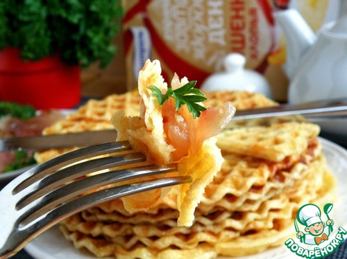 Подавать вафли очень вкусно с малосольной рыбой – у меня омуль – нарезанной тонкими ломтиками, или с овощным салатом
