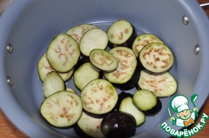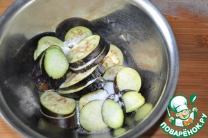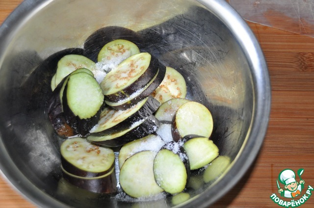 Баклажаны режем кольцами толщиной около 7 мм, засыпаем солью, чтобы избавиться от горечи и отставляем на 10 минут.