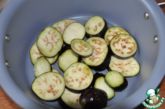 Баклажаны промываем, отжимаем. Берём толстостенную кастрюлю или казан, наливаем растительное масло. На дно кладём слой баклажанов.