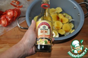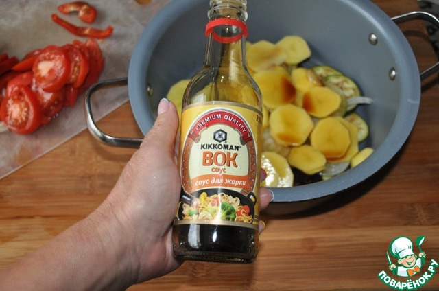 Далее кладём слои лука и картофеля и поливаем соевым соусом. Я отдала предпочтение соевому соусу для вока от ТМ "Киккоман".