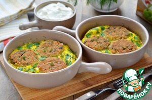3 яйца смешать с молоком, посолить и взбить вилочкой. Формы смазать сливочным маслом, вылить омлетную смесь, уложить в каждую форму по 3 котлетки.
