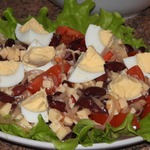 На тарелку выложить листья салата, сверху салат и яйца, разрезанные на 4 части.