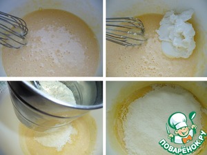 Добавить рикотту, перемешать. Кукурузную муку смешать с разрыхлителем и просеть в чашу. Добавить просеянную пшеничную муку (добавляйте частями).