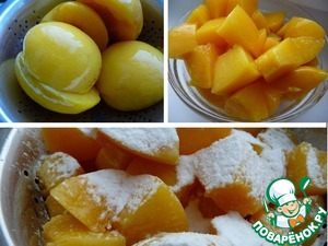 Половинки персиков выложить в дуршлаг, чтобы убрать лишнюю влагу, нарезать небольшими кусочками, припудрить крахмалом.