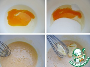 В чаше смешать яйцо, щепотку соли, ванильный сахар и сахар. Все перемешать верчиком. Добавить мягкий маргарин (масло), перемешать.