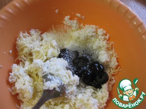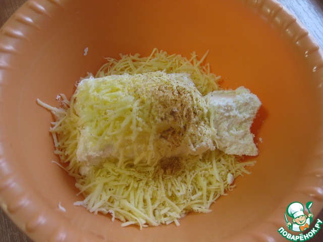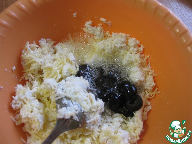 Включим духовку на разогрев до 200С и займемся начинкой, - творог смешать с натертым сыром и щепоткой чили