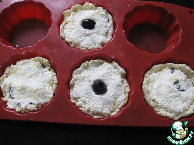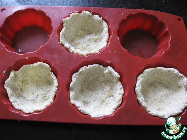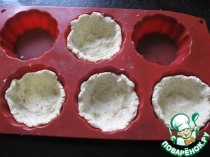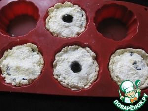 Подготавливаем формочки (у меня силиконовые для кексов), достаем тесто, делим его на 4 части, и руками распределяем каждый кусочек по формочке, делая бортики