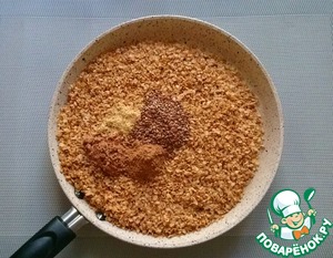 Добавляем к хлопьям какао, корицу, имбирь, семена льна (эти семена дико полезные, но за неимением оных можно взять семена подсолнечника, кунжут или еще что-нибудь на выбор). Затем помещаем на сильный огонь и перемешиваем, не переставая, пока не будет раздаваться характерное пощелкивание и потрескивание (минут 5).