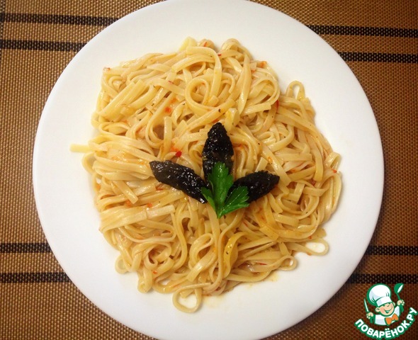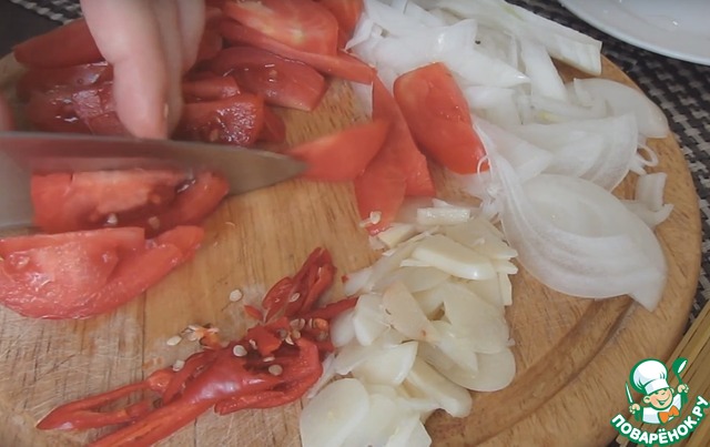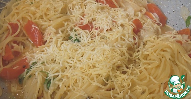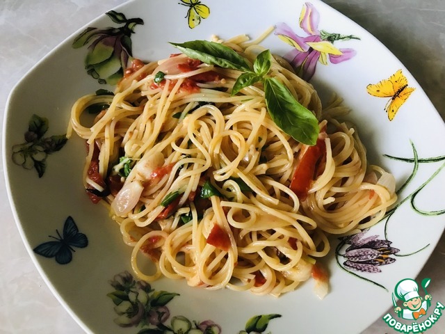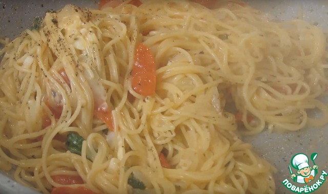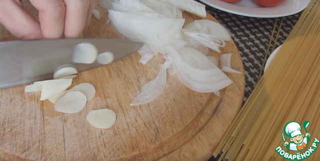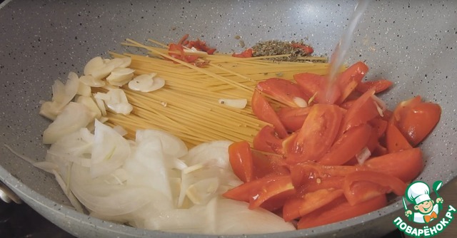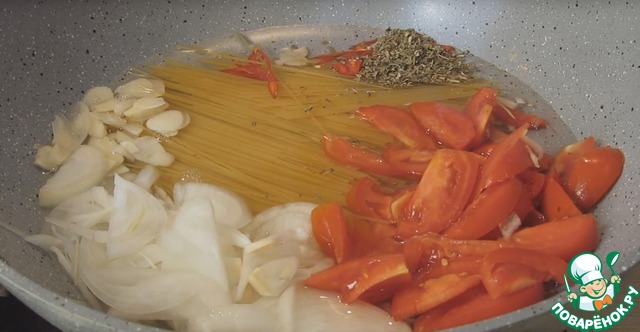 Спагетти выложить в центре сковороды. Вокруг выложит лук, чеснок, перец чили, помидоры, сухой базилик.