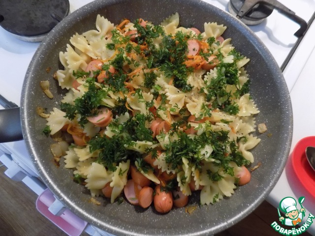 Петрушку мелко рубим, сосиски режем. Паста готова, откидываем её на дуршлаг и опять в кастрюлю.