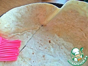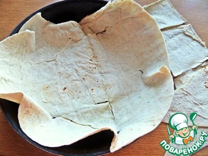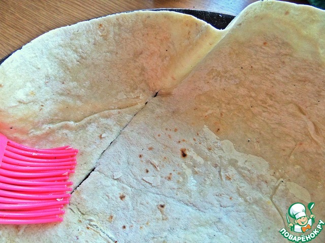 • Итак, начинаем игры с лавашом. Выкраиваем круг по форме. Моя диаметром-22 см. Не беда, если круг не выходит, можно подставить кусочек. Главное, чтобы пласт был внахлёст.