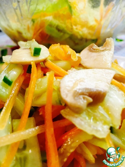 Салат немного измельчаем, добавляем к нему овощи и грибы