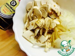 Грибы моем, режем пластинками, лук нарезаем четвертькольцами