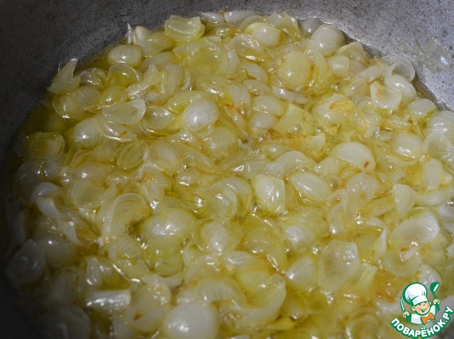Обжариваем лук в растительном масле на небольшом огне до золотистого цвета. Крышкой не закрываем. Мне так понравились луковые хлопья, прям как ракушки!