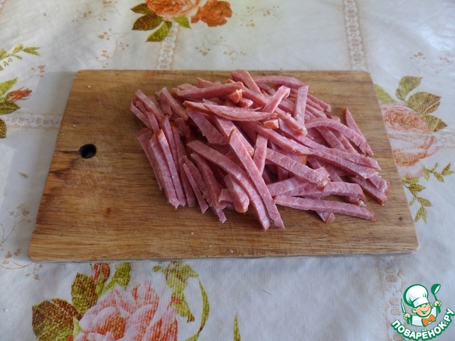 Соломкой нарезаем колбасу.