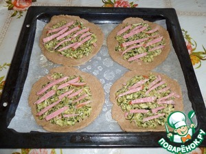 Выкладываем лепешки на противень. На лепешки выкладываем половину нарезанной колбасы.