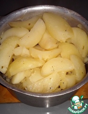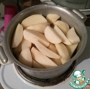 Картофель очистить. Я его еще нарезаю на четыре части (чтоб быстрей сварился), но это уже на ваше усмотрение.