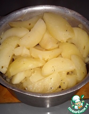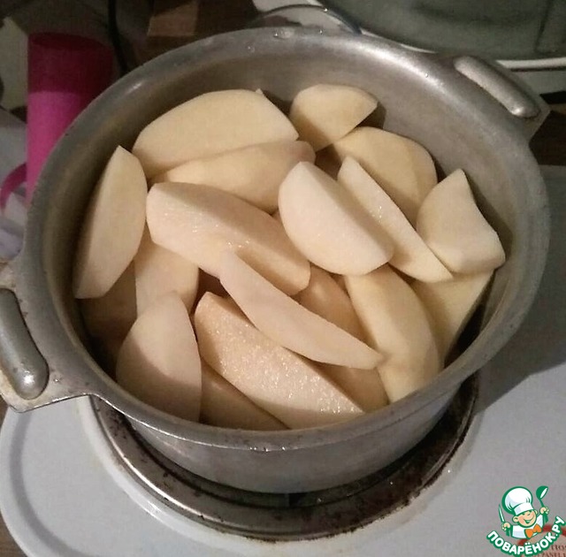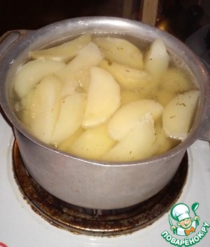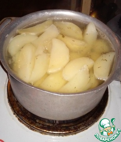 Картофель варим до готовности. После того как он сварился, сливаем с него "картофельный бульон".