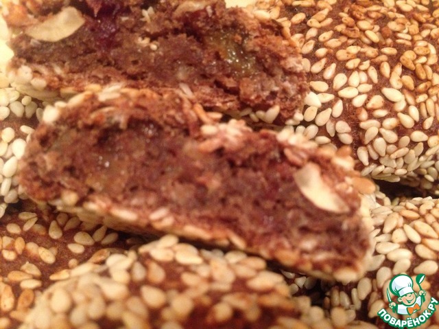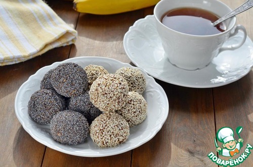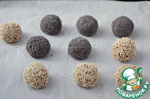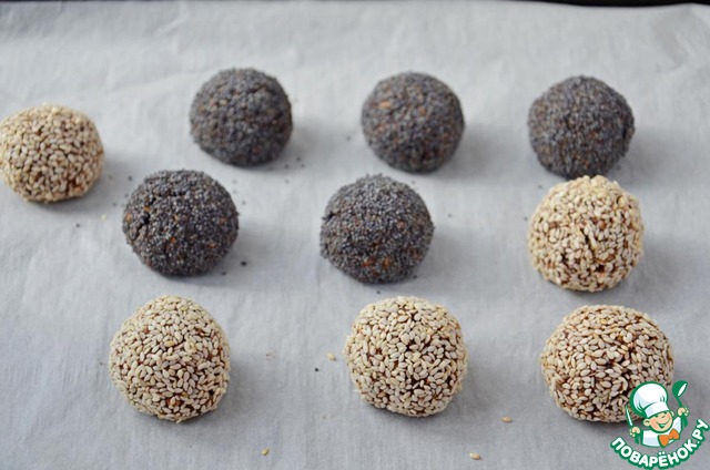 Разделить смесь на 10 частей и влажными руками сформовать шарики величиной с грецкий орех. Обвалять половину шариков в кунжуте, вторую в маке... или все шарики сделать в одной панировке. Выложить шарики на лист застеленный пекарской бумагой. выпекать в разогретой духовке до 180 градусов минут 15-20.