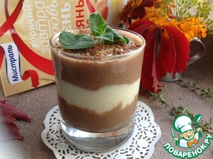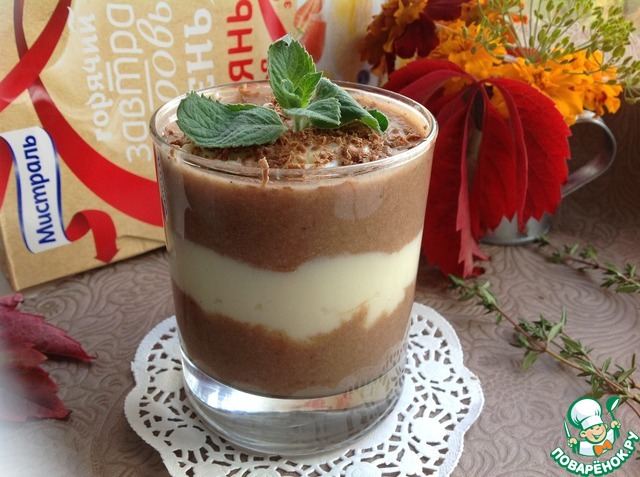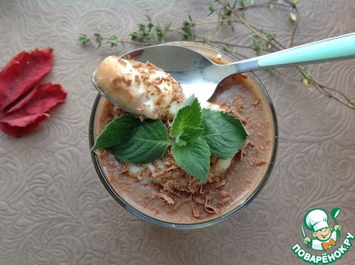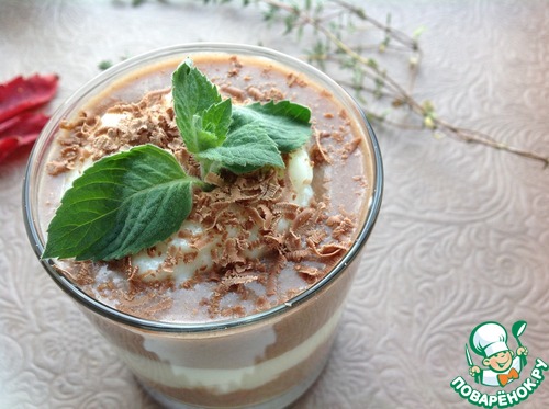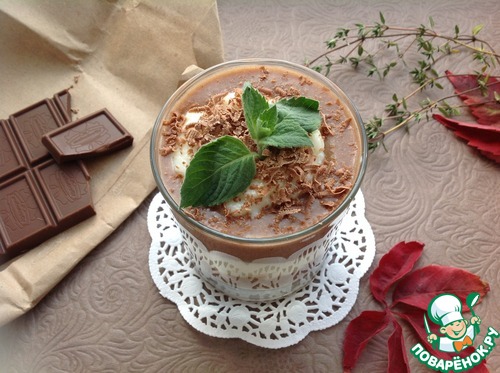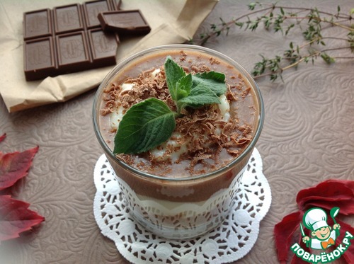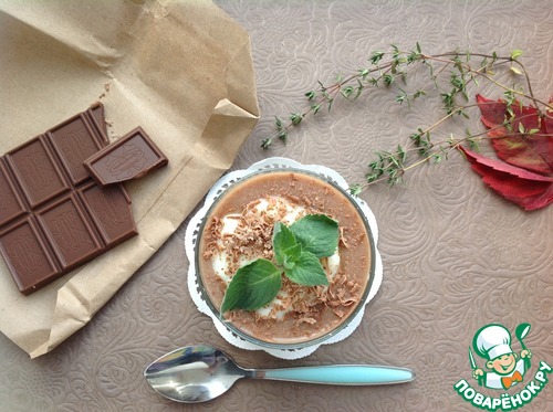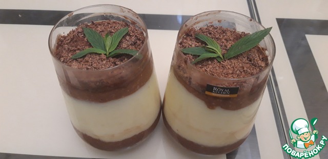 В бокал выложить банановое пюре и оставшийся крем, чередуя слои. Украсить натертым на терке молочным шоколадом и веточкой мяты. Десерт желательно охладить перед подачей, как минимум в течение часа.