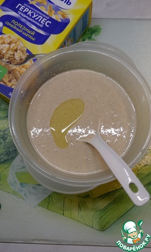 Во взбитую яичномолочную смесь вводим перемолотый геркулес и соду гашеную уксусом. Добавляем ложку оливкового масла. Важно масло добавить в конце, после взбивания яиц и молока.