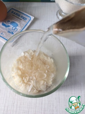 Полстакана рисовых хлопьев залить 1 стаканом кипятка и перемешать.
