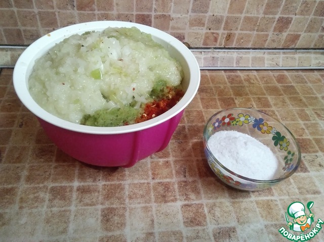 Огурцы натереть на крупной тёрке, остальные овощи пропустить через мясорубку.