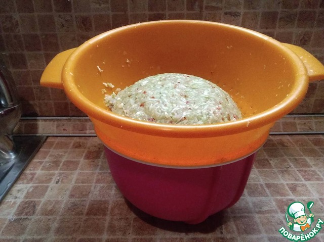 Получившуюся массу вылить в дуршлаг, тщательно отжать и оставить часов на 5. Периодически можно подходить и "отжиматься". Наша задача - получить максимально сухую массу.