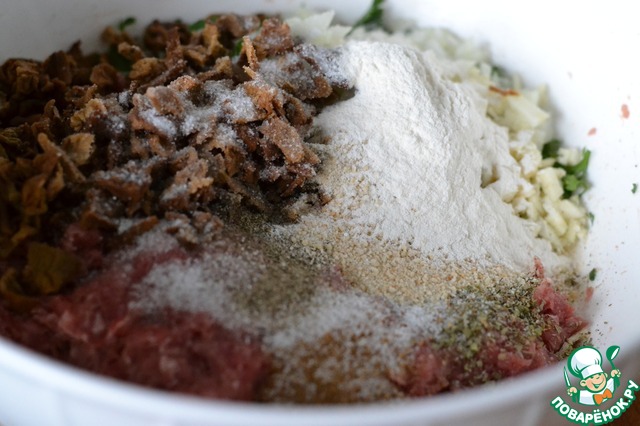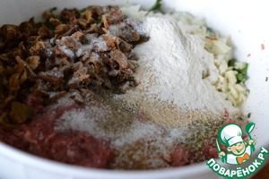 • В большой миске смешать нарезанные грибы, фарш, лук, чеснок, петрушку, майоран, тмин, соль, яйцо, муку и панировочные сухари. Хорошо перемешать рукой.