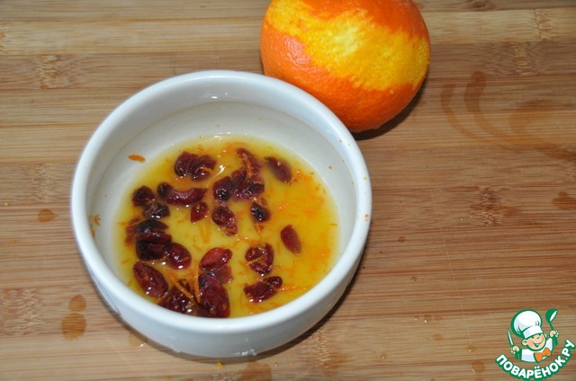 Берём вяленую клюкву, добавляем к ней натёртую цедру апельсина и свежевыжатый апельсиновый сок. Отставляем настояться.