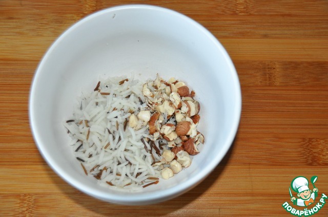 Фундук измельчаем в ступке, добавляем к готовому рису. -