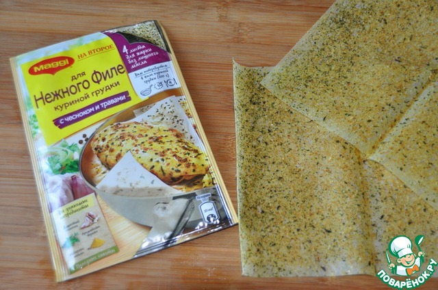 Для приготовления куриного филе для салата, берём приправу MAGGI® На второе для нежного филе куриной грудки c чесноком и травами. В этой приправе находится 4 листа с приправами, пропитанных маслом, поэтому жарка без лишнего масла.