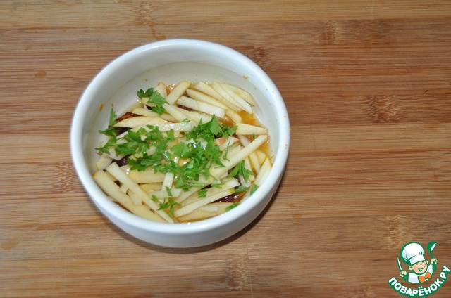 К замоченной клюкве добавляем порезанное тонкой соломкой яблоко, рубленную зелень петрушки и оливковое масло. Перемешиваем.