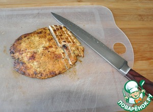 Отбиваем куриную грудку до 1,5-2 см, кладём на половину листа для жарки.
