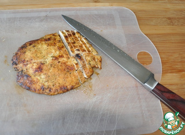 Готовую куриную грудку освобождаем от бумаги и режем тонкими полосками.