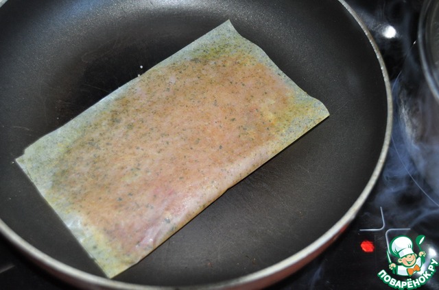 На сухую нагретую сковороду кладём завёрнутую грудку. Листы бумаги пропитана маслом, нет необходимости наливать масло на сковороду.