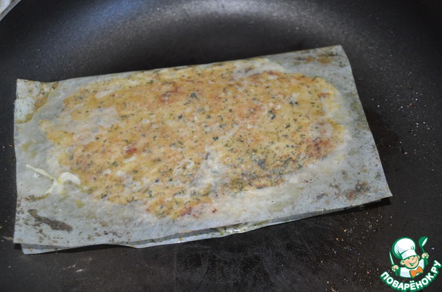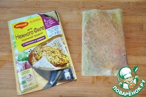 • Грудку отбиваем до толщины 1,5-2 см, кладём на половину листа.