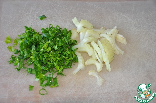 • Пока готовится куриное филе, режем тонкими полосками черешковый сельдерей, измельчаем зелёный лук и кинзу.