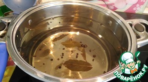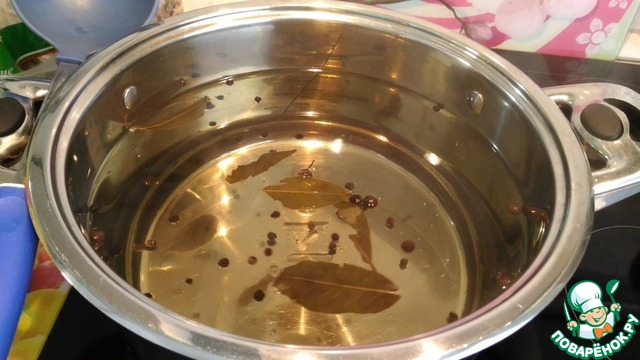 У меня такой: в кипящую воду кладем соль, сахар, лавровый лист, горошек черного перца и душистый перец. Выключаем, добавляем уксусную эссенцию. -