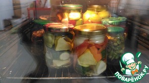 Ставим банки в духовку и пастеризуем 15-30 минут (в зависимости от температуры рассола). Укутываем до полного остывания.