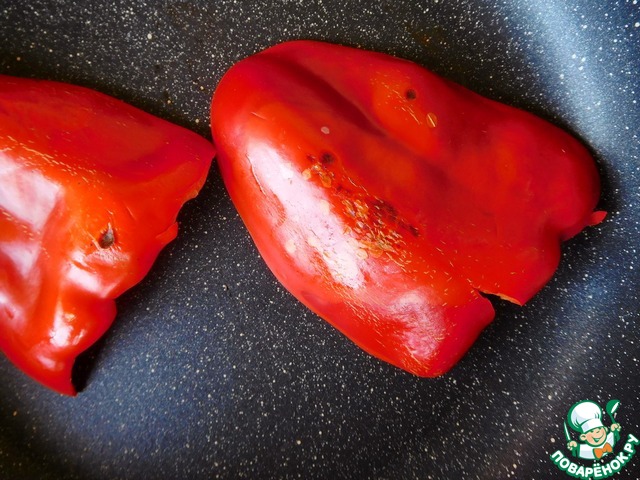 В это время, перцы очищаем, удаляем семена и пленочки. Обжариваем на сильном огне в течении минут 5-6, на сухой сковороде (с хорошим антипригарным покрытием), переворачивая!