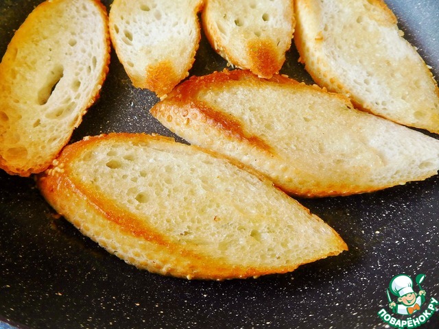 Параллельно обжариваем кусочки багета (я обжаривала на чайной ложке сливочного масла).