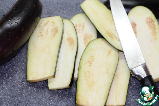 Баклажаны нарезать слайсами (тонкими пластинами) слегка присолить и оставить на 10-15 минут для удаления горечи. Этот шаг многие пропускают.