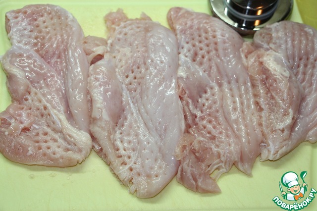 Филе куриных грудок слегка отбить, слишком тонко отбивать не нужно.