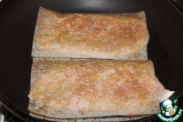 Развернуть лист для жарки и положить на одну половинку 1 филе.